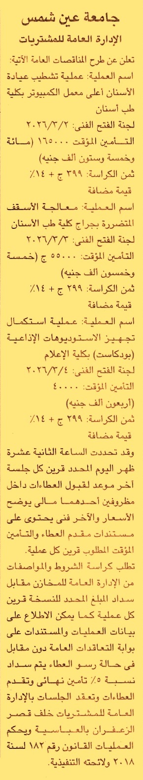 HOT information مناقصة عامة لعملية تشطيب عيادة الأسنان أعلى معمل الكمبيوتر بكلية طب أسنان عن جريدة الجمهورية Post navigation نادي شبرا الخيمة الرياضي وزارة التربية والتعليم والتعليم الفني