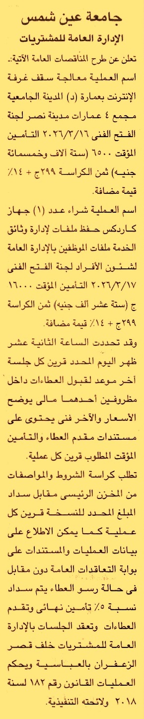 HOT Information مناقصة عامة لعملية معالجة سقف غرفة الانترنت بعمارة “د” بالمدينة الجامعية مجمع 4 عمارات بمدينة نصر عن جريدة الجمهورية Post navigation مركز التنمية الشبابية بشبرا البلد الهيئة العامة للأبنية التعليمية