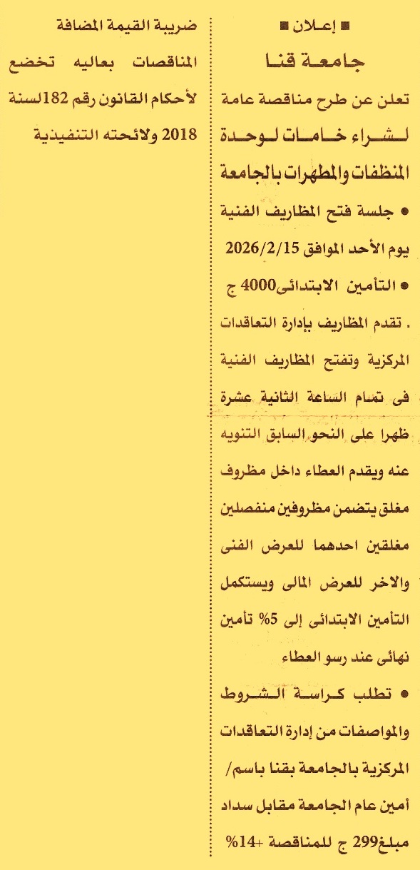 HOT information مناقصة عامة لعملية توريد خامات لوحدة المنظفات والمطهرات بالجامعة عن جريدة الأهرام Post navigation شركة الدلتا للسكر شركة مضارب الغربية