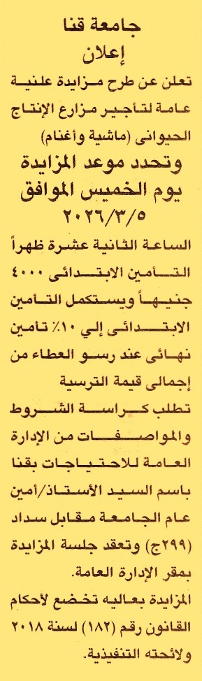 HOT Information مزايدة علنية عامة لعملية تأجير مزارع الإنتاج الحيواني “ماشية وأغنام” عن جريدة الجمهورية Post navigation مركز شباب مدينة قنا الإدارة العامة لصرف غرب كفر الشيخ