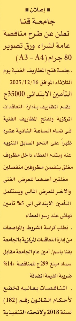 HOT Information مناقصة عامة لعملية توريد ورق تصوير 80 جرام “A3, A4” عن جريدة الأهرام Post navigation مديرية المساحة ببني سويف محافظة المنيا
