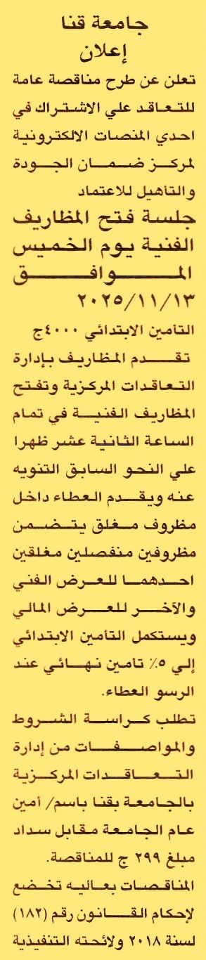 HOT Information مناقصة عامة لعملية التعاقد على الاشتراك في إحدى المنصات الالكترونية لمركز ضمات الجودة والتأهيل للاعتماد عن جريدة الجمهورية Post navigation مركز شباب ميت بره بالمنوفية مركز شباب أحمد عبده الجديد بالسويس