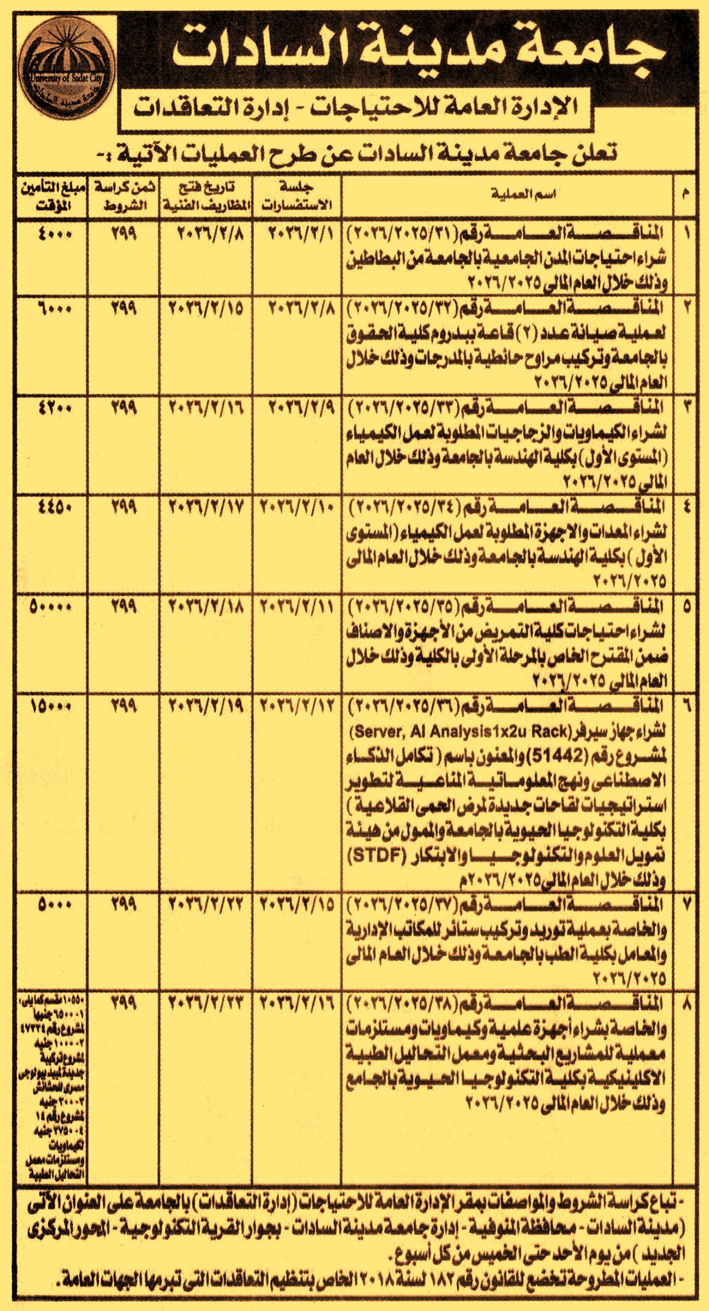 HOT Information مناقصة عامة رقم 31/2025/2026 لعملية توريد احتياجات المدن الجامعية من البطاطين (جلسة الاستفسارات يوم 1/2/2026) عن جريدة الجمهورية Post navigation الجهاز المركزي للمحاسبات مركز شباب السحارة بالإسماعيلية