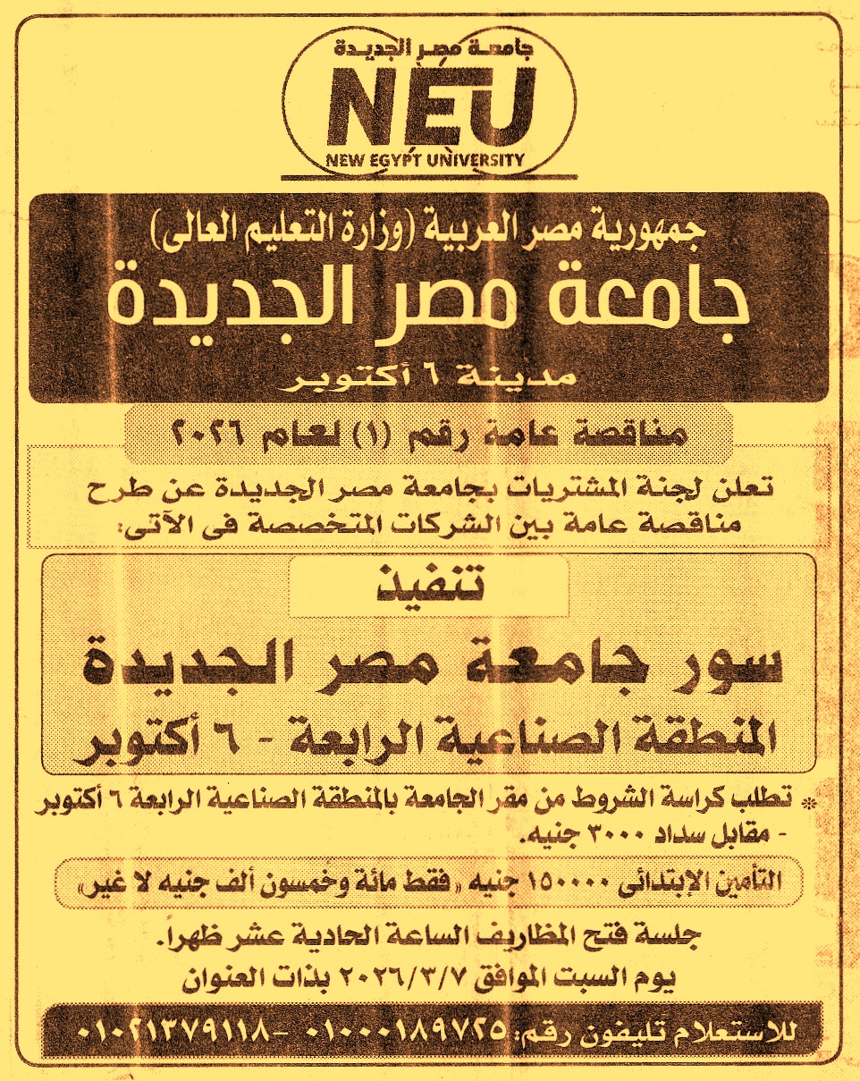 HOT Information مناقصة عامة رقم 1/2026 لعملية تنفيذ سور الجامعة عن جريدة الأخبار Post navigation جهاز تنمية مدينة السويس الجديدة مركز شباب شلقان