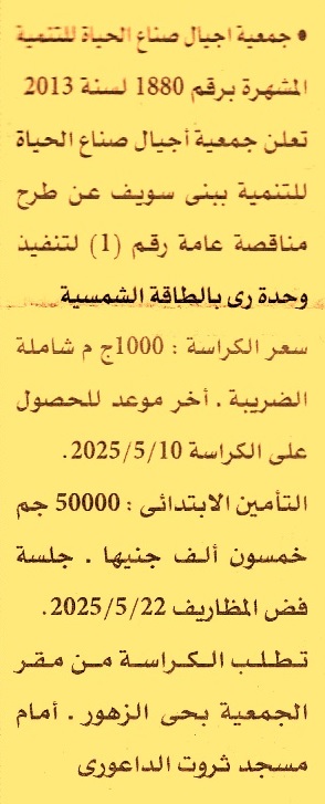 HOT Information مناقصة عامة رقم 1 لعملية تنفيذ وحدة ري بالطاقة الشمسية (أخر موعد لشراء الكراسة يوم 10/5/2025) عن جريدة الأهرام Post navigation الهيئة العامة لموانئ البحر الأحمر شركة الغازات البترولية