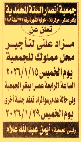 HOT Information مزايدة علنية لعملية تأجير محل مملوك للجمعية (تعاد الجلسة يوم 29/1/2025 في حالة عدم الرسو) عن جريدة الجمهورية Post navigation بنك التعمير والإسكان الخبير المثمن للمزادات