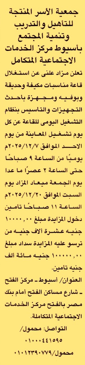 HOT Information مزايدة علنية لعملية استغلال قاعة مناسبات مكيفة وحديقة وبوفيه ومجهزة بأحدث التجهيزات والتأسيس بنظام التشغيل اليومي للقاعة (المعاينة من يوم 7/12/2025 يوميا من الساعة 9 ص حتى 2 ع ما عدا يوم الجمعة) عن جريدة الجمهورية Post navigation النقابة العامة للعاملين بالصناعات الهندسية والمعدنية والكهربائية محافظة سوهاج