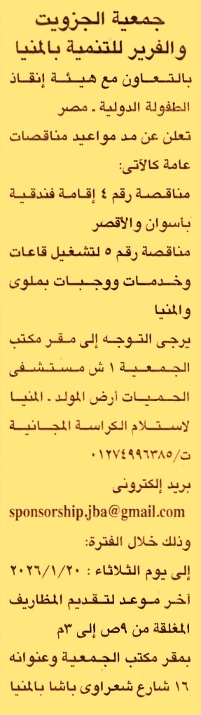 وأخر موعد لتقديم العطاءات يوم 20/1/2026 الساعة 3م