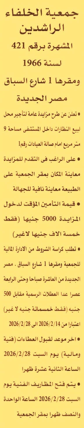HOT Information مزايدة عامة لعملية تأجير محل لبيع النظارات داخل المستشفى بمساحة 9م2 أمام صالة العيادات رقم 1 (تباع الكراسة من الساعة 10 ص حتى 4 ع ما عدا يوم الجمعة ومدة سريان خطاب الضمان 3 أشهر ويرفق مع المستندات سابقة أعمال) عن جريدة الأهرام Post navigation هيئة إنقاذ الطفولة – مكتب مصر نادي أهلي فارسكور بدمياط