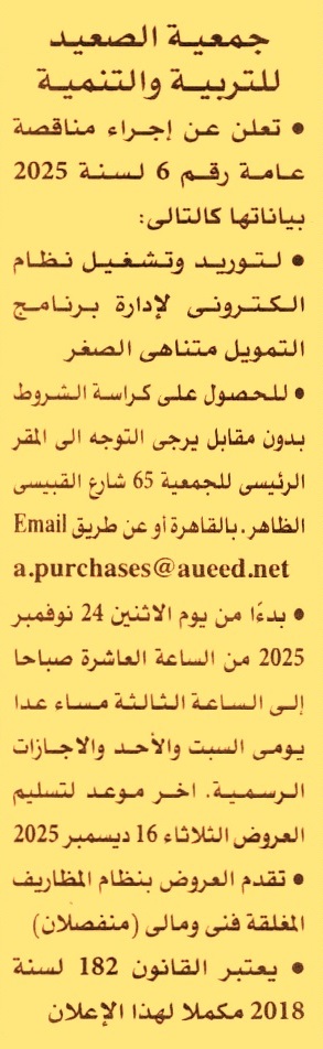 HOT Information مناقصة عامة رقم 6/2025 لعملية توريد وتشغيل نظام الكتروني لإدارة برنامج التمويل متناهي الصغر (يتم الحصول على الكراسة من يوم 24/11/2025 من الساعة 10 ص حتى 3 ع عدا يومي السبت والأحد والإجازات الرسمية) عن جريدة الأهرام Post navigation محافظة الدقهلية الوحدة المحلية لمركز ومدينة قلين