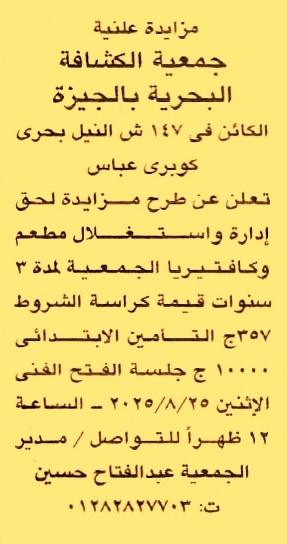 HOT Information مزايدة عامة لعملية حق إدارة واستغلال مطعم وكافتيريا الجمعية لمدة 3 سنوات عن جريدة الجمهورية Post navigation الوحدة المحلية لمركز ومدينة سنورس الوحدة المحلية لمركز ومدينة الفيوم
