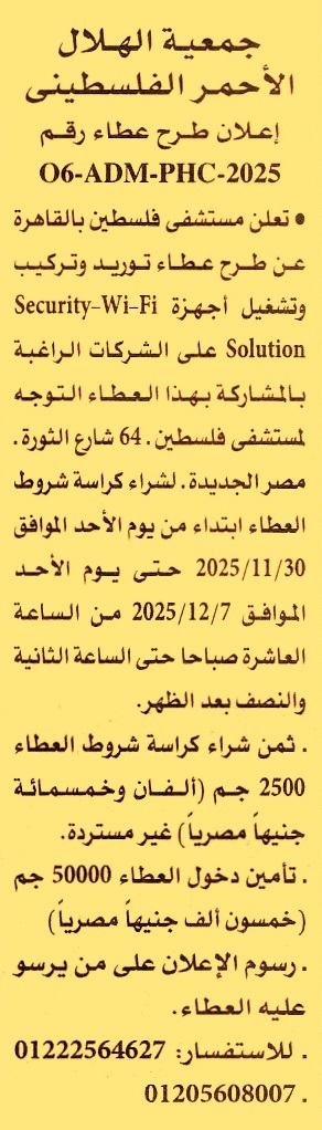 HOT Information مناقصة عامة رقم 06-ADM-PHC-2025 لعملية توريد وتركيب وتشغيل أجهزة Security Wi-Fi Solution (تباع الكراسة من يوم 30/11/2025 وحتى يوم 7/12/2025 من الساعة 10 ص حتى 2:30 م) عن جريدة الأهرام Post navigation الإدارة العامة لتطوير وحماية نهر النيل شمال فرع دمياط هيئة الإغاثة الكاثوليكية