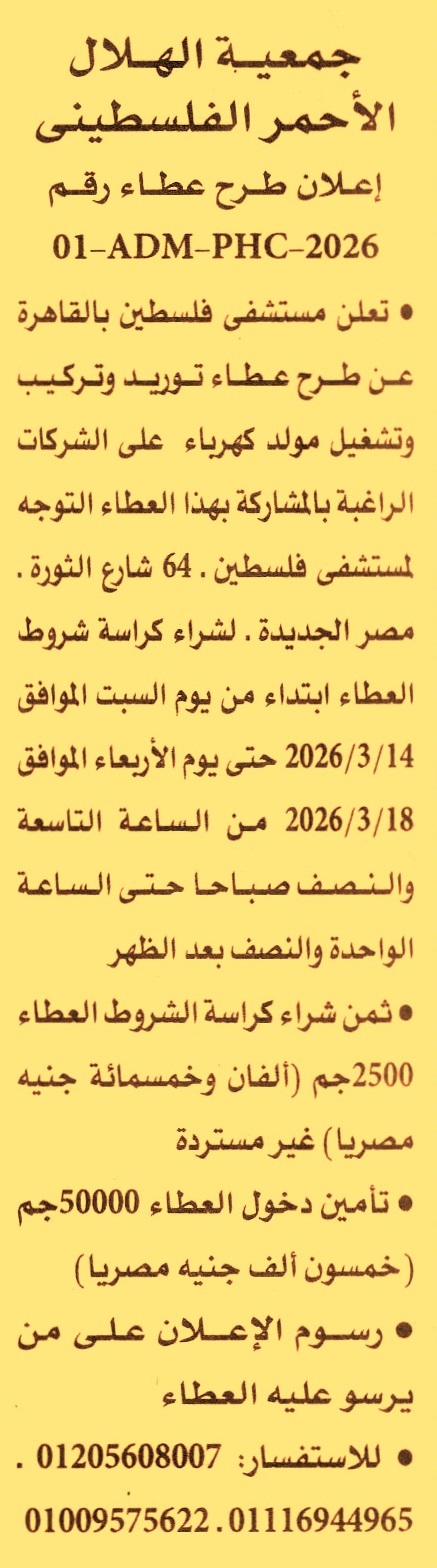 HOT information مناقصة عامة رقم 01-ADM-PHC-2026 لعملية توريد وتركيب وتشغيل مولد كهرباء (تباع الكراسة من يوم 14/3/2026 وحتى يوم 18/3/2026 من الساعة 9:30 ص حتى 1:30 م) عن جريدة الأهرام Post navigation مؤسسة مستشفى أورام الأطفال 57357 شركة قنا لصناعة الورق