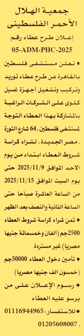 HOT information مناقصة عامة رقم 05-ADM-PHC-2025 لعملية توريد وتركيب وتشغيل أجهزة غسيل كلوي (تباع الكراسة من يوم 9/11/2025 وحتى يوم 15/11/2025 من الساعة 10 ص حتى 2:30 م) عن جريدة الأهرام Post navigation جمعية رسالة للأعمال الخيرية جامعة الزقازيق