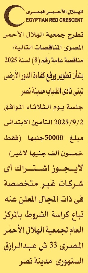 HOT information مناقصة عامة رقم 8/2025 لعملية تطوير ورفع كفاءة الدور الأرضي لمبنى نادي الشباب بمدينة نصر عن جريدة الأهرام Post navigation محافظة شمال سيناء الهيئة العامة للتنمية الصناعية