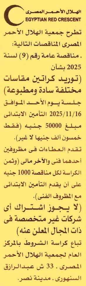 HOT information مناقصة عامة رقم 9/2025 لعملية توريد كراتين مقاسات مختلفة سادة ومطبوعة عن جريدة الأهرام Post navigation شركة مصر العليا لتوزيع الكهرباء الهيئة العامة للتنمية الصناعية