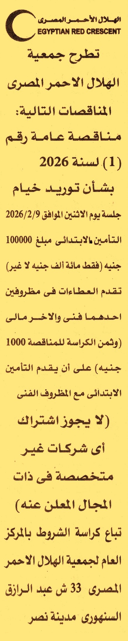 HOT Information مناقصة عامة رقم 1/2026 لعملية توريد خيام عن جريدة الأهرام Post navigation مركز شباب كفر عبد الخالق بالعدوة الجمعية التعاونية العامة للإصلاح الزراعي