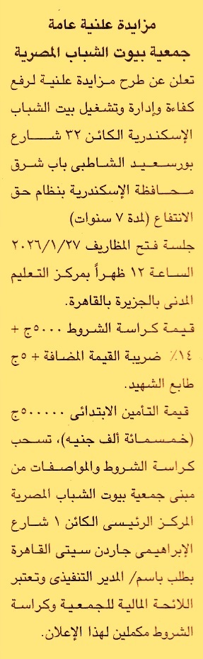 HOT Information مزايدة علنية عامة لعملية رفع كفاءة وإدارة وتشغيل بيت الشباب بالإسكندرية الكائن 32 ش بورسعيد – الشاطبي – باب شرق – محافظة الإسكندرية بنظام حق الإنتفاع لمدة 7 سنوات عن جريدة الجمهورية Post navigation نادي تجديف بورسعيد جمعية بيوت الشباب المصرية