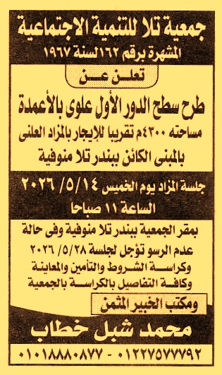 HOT information مزايدة علنية لعملية تأجير سطح الدور الأول علوي بالأعمدة بمساحة 4300م تقريبا بالمبنى الكائن ببندر تلا – المنوفية (تعاد الجلسة يوم 28/5/2026 في حالة عدم الرسو) عن جريدة الأخبار Post navigation شركة مصر إدفو للب وورق الكتابة والطباعة محافظة الجيزة