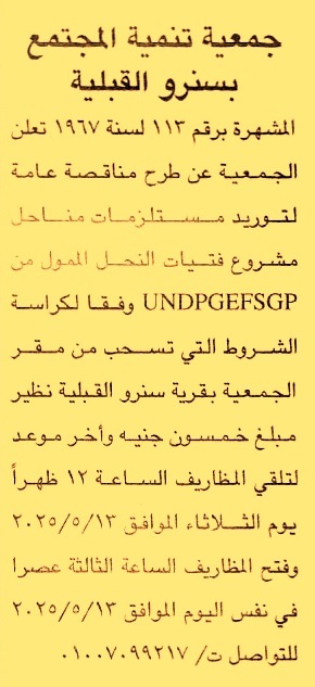HOT Information مناقصة عامة لعملية توريد مستلزمات مناحل لمشروع فتيات النحل الممول من UNDPGEFSGP عن جريدة الجمهورية Post navigation الوحدة المحلية لمركز ومدينة الغنايم نادي كفر الزيات الرياضي