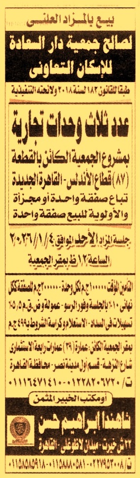 HOT Information مزايدة علنية لعملية بيع عدد 3 وحدات تجارية بمشروع الجمعية الكائن بالقطعة 87 قطاع الأندلس – القاهرة الجديدة (صفقة واحدة أو مجزأة والأولوية للبيع صفقة واحدة) عن جريدة الجمهورية Post navigation محافظة الدقهلية جمعية مستشفى الأنجلو أمريكان