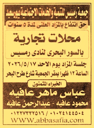HOT information مزايدة علنية لعملية تأجير محلات تجارية بالسور البحري لنادي رمسيس بنظام حق الانتفاع لمدة 5 سنوات عن جريدة الأخبار Post navigation الوحدة المحلية لمدينة رأس سدر نادي أبو الريش قبلي الرياضي