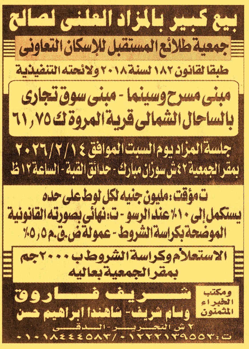HOT information مزايدة علنية لعملية بيع مبنى مسرح وسينما ومبنى سوق تجاري بالساحل الشمالي – قرية المروة ك 61.75 (تسهيلات في السداد) عن جريدة الجمهورية Post navigation نادي أشمون الرياضي بالمنوفية جمعية مسجد الصحابة بسوهاج