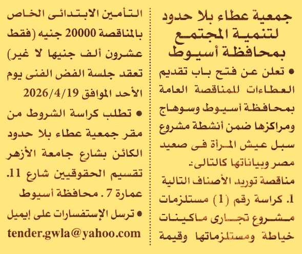 HOT Information مناقصة عامة لعملية توريد مستلزمات مشروع تجاري “ماكينات خياطة ومستلزماتها” ضمن أنشطة مشروع سبل عيش المرأة في صعيد مصر عن جريدة الأهرام Post navigation EGYPTIAN ELECTRICITY TRANSMISSION COMPANY الهيئة العامة لصندوق هيئة دور المحاكم والشهر العقاري مساعد الوزير
