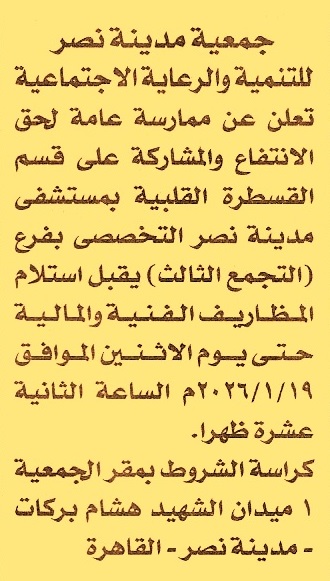 HOT Information ممارسة عامة لعملية حق الانتفاع والمشاركة على قسم القسطرة القلبية بمستشفى مدينة نصر التخصصي بفرع التجمع الثالث (تقدم العطاءات حتى يوم 19/1/2026) عن جريدة الأخبار Post navigation الإدارة العامة لري جنوب الدقهلية الهيئة العامة للرعاية الصحية فرع جنوب سيناء