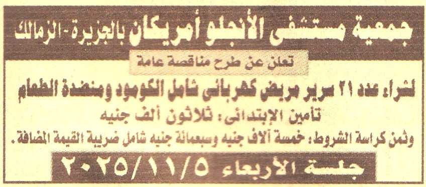 HOT information مناقصة عامة لعملية توريد عدد 21 سرير مريض كهربائي شامل الكومود ومنضدة الطعام عن جريدة الجمهورية Post navigation محافظة الغربية رئاسة مركز ومدينة طنطا الهيئة العامة للجهاز التنفيذي لمشروعات تحسين الأراضي