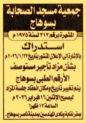 تعلن الجمعية عن تغيير تاريخ ومكان انعقاد جلسة المزايدة العلنية لعملية