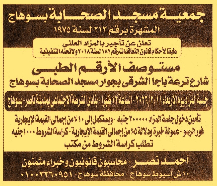 HOT information مزايدة علنية لعملية تأجير مستوصف الأرقم الطبي بشارع ترعة باجا الشرقي – بجوار مسجد الصحابة – سوهاج عن جريدة الجمهورية Post navigation جمعية طلائع المستقبل للإسكان التعاوني مركز شباب أرض اللواء