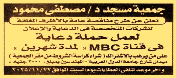HOT information مناقصة عامة لعملية عمل حملة دعاية في قناة MBC لمدة شهرين (أخر موعد لتلقي العطاءات يوم 22/11/2025) عن جريدة الجمهورية Post navigation مركز شباب الإتحاد بالإسماعيلية نادي طلعت حرب