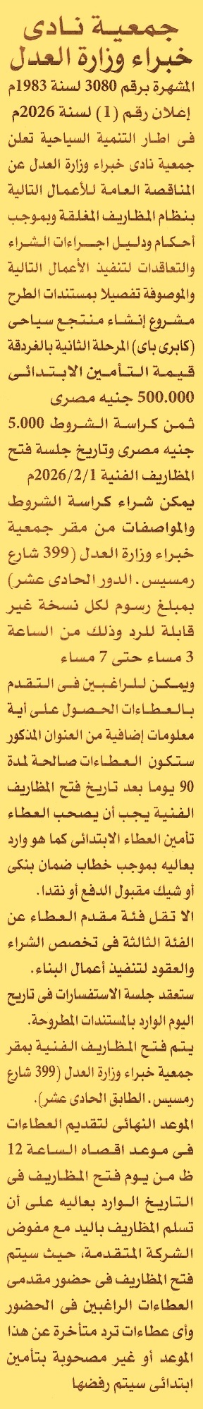 HOT Information مناقصة عامة لعملية إنشاء منتجع سياحي “كابري باي” المرحلة الثانية بالغردقة (تباع الكراسة من الساعة 3 م حتى 7 م ومدة سريان العطاءات 3 أشهر وفئة التصنيف الثالثة شعبة أعمال المباني) عن جريدة الأهرام Post navigation جامعة العاصمة محافظة سوهاج