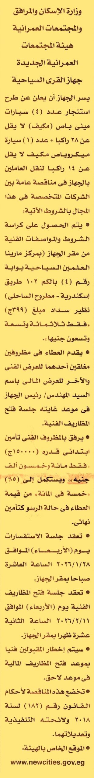 HOT Information مناقصة عامة لعملية استئجار عدد 4 سيارات ميني باص مكيف لا يقل عن 28 راكب وعدد 1 سيارة ميكروباص مكيف لا يفل عن 14 راكب لنقل العاملين بالجهاز (جلسة الإستفسارات يوم 28/1/2026 الساعة 10 ص) عن جريدة الأخبار Post navigation محافظة أسيوط جامعة الفيوم