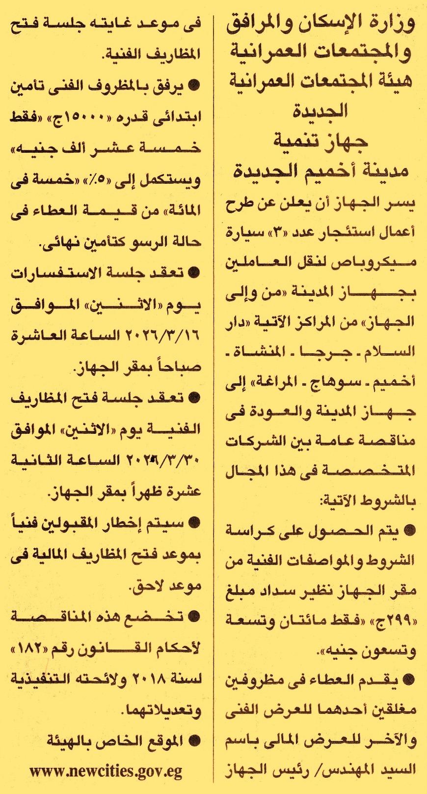 تأجير عدد 3 سيارة ميكروباص لنقل العاملين بجهاز المدينة من وإلى الجهاز