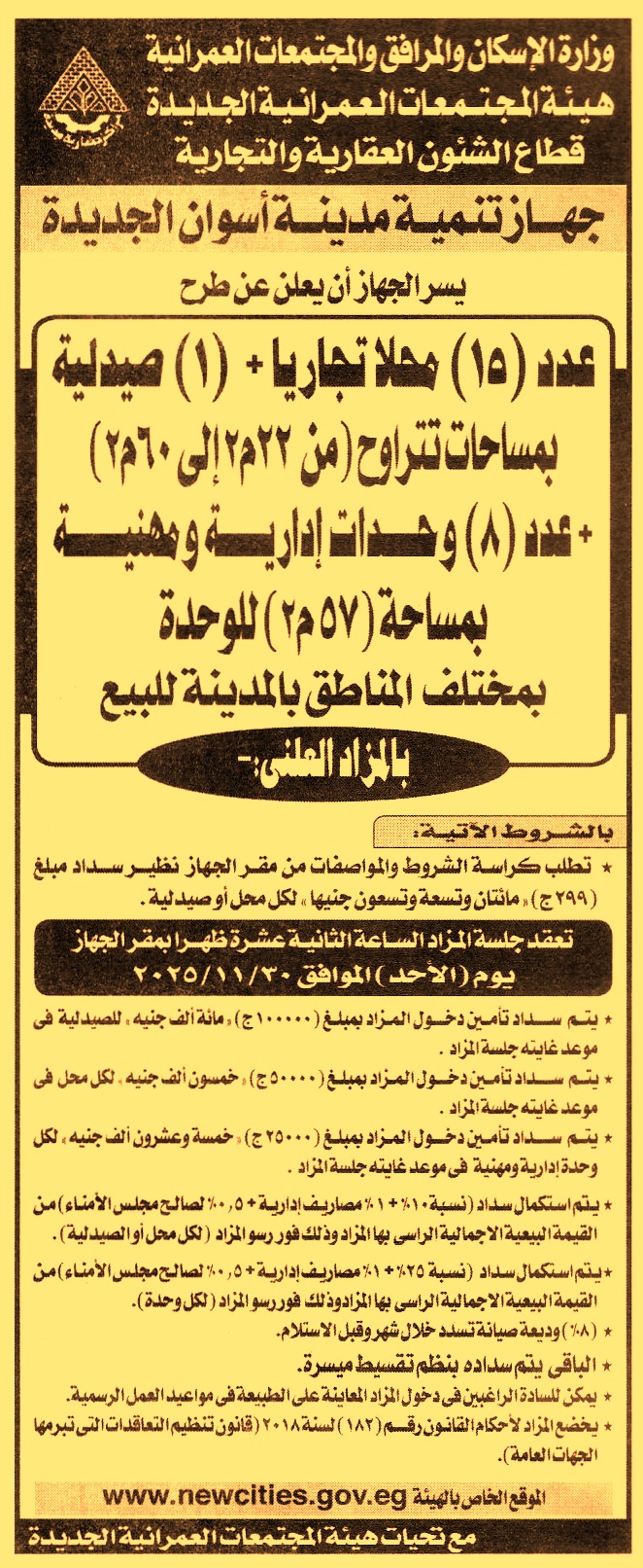 HOT Information مزايدة علنية لعملية بيع عدد 15 محل تجاري وعدد 1 صيدلية بمساحات تتراوح بين 22م2 الي 60م2 بمختلف المناطق بالمدينة (يتم سداد 8% وديعة صيانة خلال شهر وقبل الاستلام ويسدد باقي السعر بنظم تقسيط ميسرة) عن جريدة الأهرام Post navigation محافظة البحر الأحمر مكتبة الإسكندرية