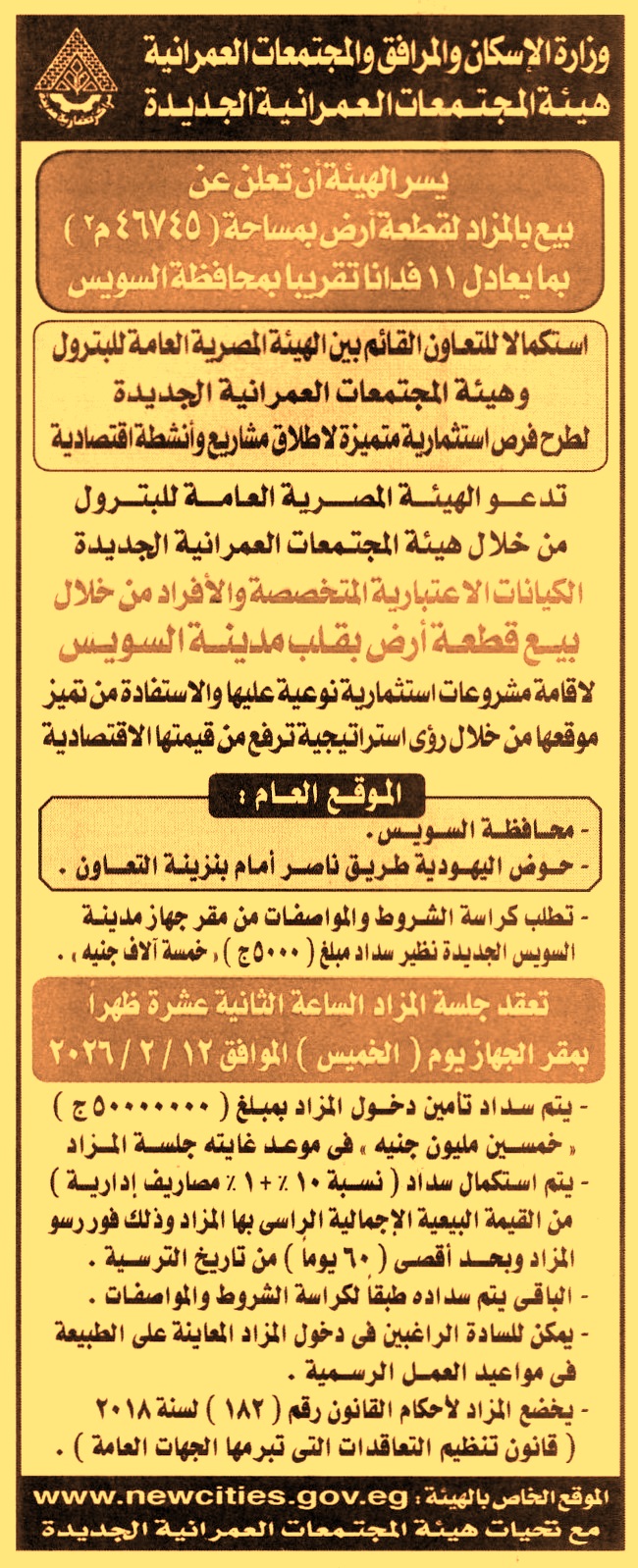 HOT Information مزايدة علنية لعملية بيع قطعة أرض بمساحة 46745م2 بما يعادل 11 فدان تقريبا بمحافظة السويس حوض اليهودية – طريق ناصر – أمام بنزينة التعاون عن جريدة الأهرام Post navigation محافظة المنوفية هيئة المجتمعات العمرانية الجديدة