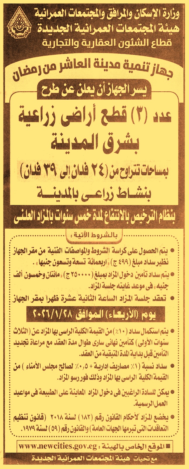 HOT Information مزايدة علنية لعملية تأجير عدد 3 قطع أراضي زراعية بشرق المدينة بمساحات تتراوح بين 24 فدان إلى 39 فدان بنشاط زراع بالمدينة بنظام حق الإنتفاع لمدة 5 سنوات عن جريدة الأخبار Post navigation جهاز تنمية مدينة العاصمة الإدارية الجديدة جهاز تنمية مدينة العاشر من رمضان