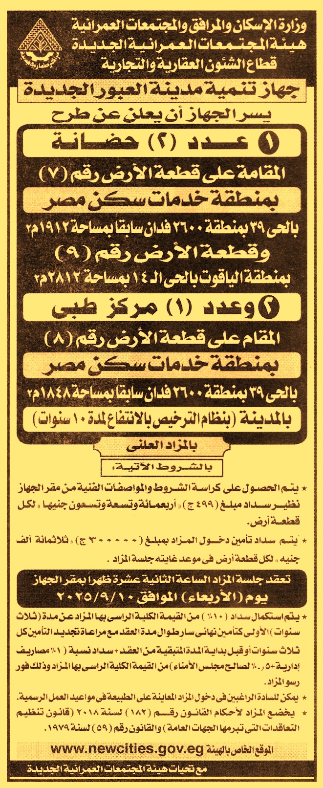 تأجير عدد 2 حضانة بمساحة 1912م2 المقامة على قطعة الأرض رقم 7 بمنطقة خدمات سكن مصر بالحي 39 بمنطقة 2600 فدان سابقا