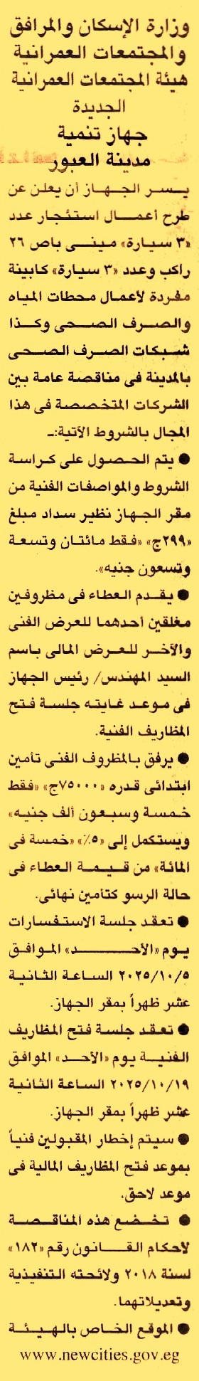 HOT information مناقصة عامة لعملية تأجير عدد 3 سيارة ميني باص 26 راكب وعدد 3 سيارة كابينة مفردة لأعمال محطات المياه والصرف الصحي وكذا شبكات الصرف الصحي بالمدينة (جلسة الإستفسارات يوم 5/10/2025) عن جريدة الجمهورية Post navigation شركة مصنع أحباب الله للغزل وزارة الشباب والرياضة
