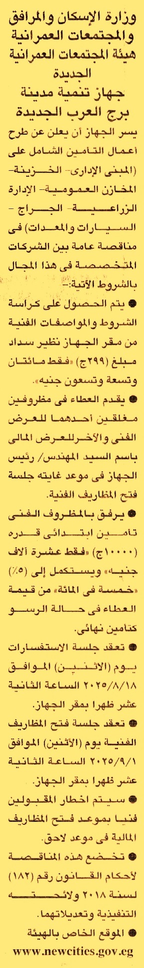 HOT Information مناقصة عامة لعملية تنفيذ أعمال التأمين الشامل على “المبنى الإداري – الخزينة – المخازن العمومية – الإدارة الزراعية – الجراج – السيارات والمعدات” (جلسة الإستفسارات يوم 18/8/2025) عن جريدة الجمهورية Post navigation مركز شباب كفر منصور بطوخ الوحدة المحلية لمركز ومدينة كوم حمادة