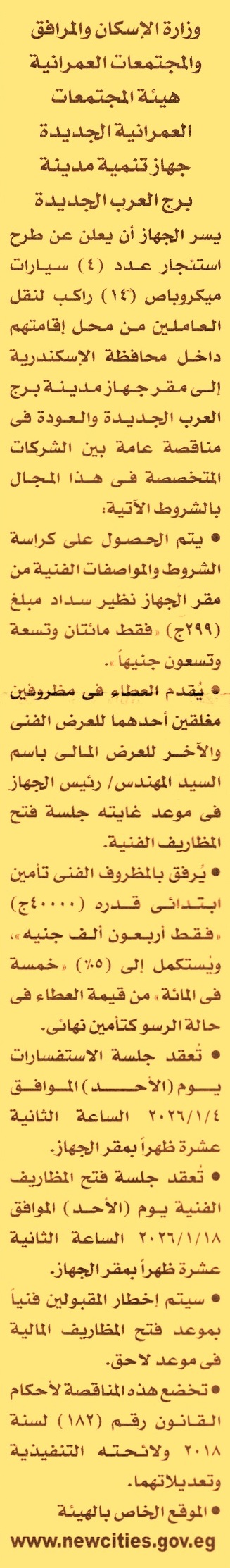 HOT Information مناقصة عامة لعملية تأجير عدد 4 سيارات ميكروباص 14 راكب لنقل العاملين من محل إقامتهم داخل محافظة الإسكندرية إلى مقر الجهاز والعودة (جلسة الإستفسارات يوم 4/1/2026) عن جريدة الأخبار Post navigation رئاسة مركز الحامول جهاز تنمية مدينة حدائق أكتوبر
