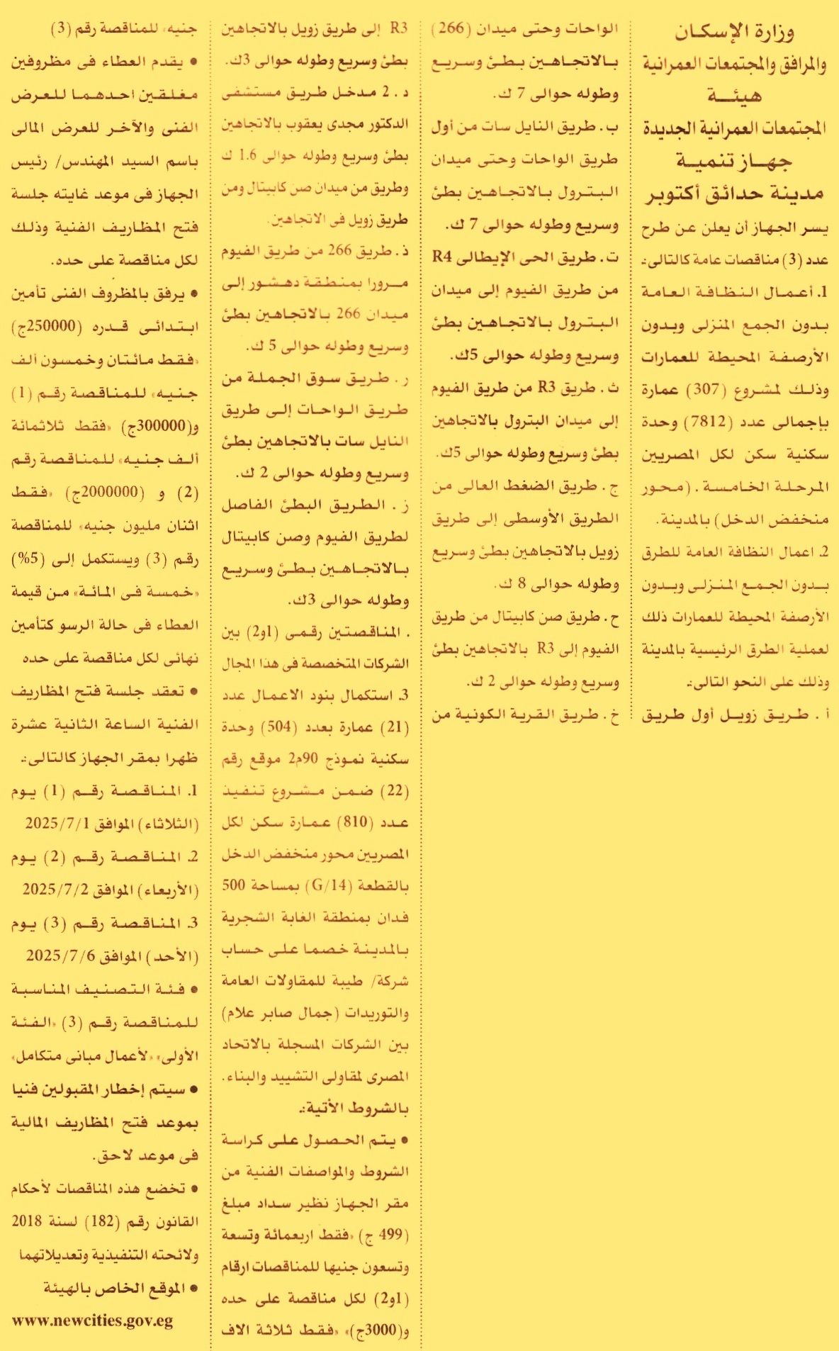 HOT Information مناقصة عامة لعملية تنفيذ أعمال النظافة العامة بدون الجمع المنزلي وبدون الأرصفة المحيطة للعمارات وذلك لمشروع 307 عمارة بإجمالي عدد 7812 وحدة سكنية سكن لكل المصريين المرحلة الخامسة “محور منخفض الدخل” بالمدينة عن جريدة الأهرام Post navigation جامعة أسيوط الأهلية مكتبة الإسكندرية