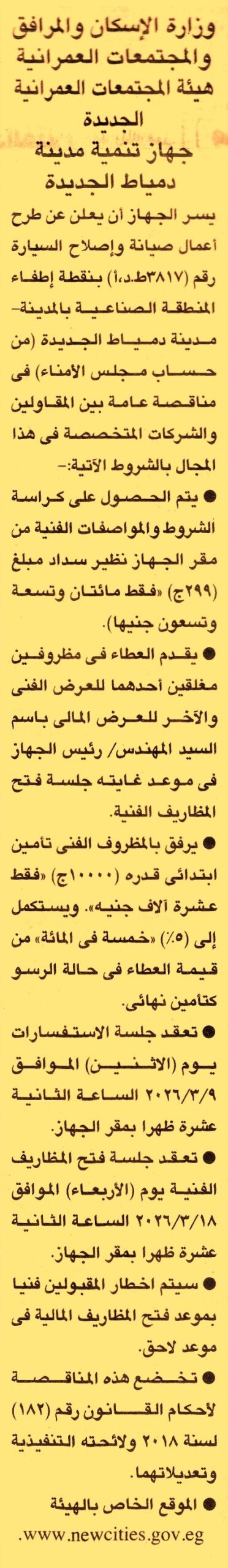 HOT Information مناقصة عامة لعملية تنفيذ أعمال صيانة وإصلاح السيارة رقم 3817 ط.د.أ بنقطة إطفاء المنطقة الصناعية بالمدينة (جلسة الاستفسارات يوم 9/3/2026) عن جريدة الجمهورية Post navigation مركز التنمية الشبابية الشبابية بأبنوب جهاز تنمية مدينة 6 أكتوبر الجديدة