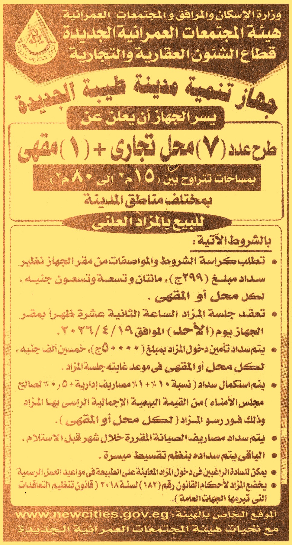 HOT Information مزايدة علنية لعملية بيع عدد 7 محلات تجارية و1 مقهى بمساحات تتراوح بين 15م2 الي 80م2 بمختلف المناطق بالمدينة (يتم سداد مصاريف الصيانة خلال شهر وقبل الاستلام ويسدد باقي السعر بنظم تقسيط ميسرة) عن جريدة الجمهورية Post navigation شركة مطاحن ومخابز الإسكندرية