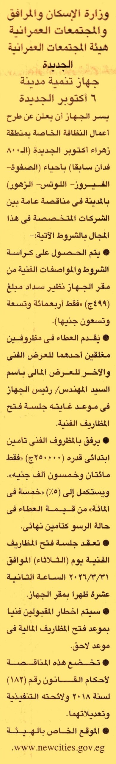HOT Information مناقصة عامة لعملية تنفيذ أعمال النظافة الخاصة بمنطقة زهراء أكتوبر الجديد “الـ 800 فدان سابقا” بأحياء الصفوة, الفيروز, اللوتس, الزهور بالمدينة عن جريدة الجمهورية Post navigation جهاز تنمية مدينة دمياط الجديدة نادي حدائق الأهرام