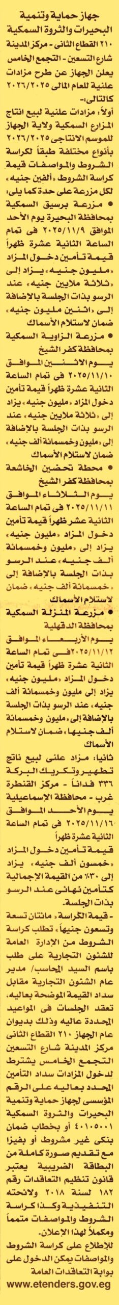 HOT Information مزايدة علنية لعملية بيع إنتاج مزرعة برسيق السمكية بمحافظة البحيرة للموسم الإنتاجي 2025/2026 بأنواع مختلفة (يسدد مبلغ 2.000.000ج ضمان لاستلام الأسماك) عن جريدة الأخبار Post navigation محافظة الدقهلية الإدارة العامة المتكاملة لري شرق الفيوم