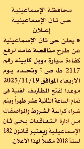 HOT Information مناقصة عامة لعملية رفع كفاءة سيارة دوبل كابينة رقم 2117 ط ص أ عن جريدة الأهرام Post navigation الهيئة العامة للاستثمار والمناطق الحرة شركة الغازات البترولية