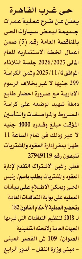 HOT information مناقصة عامة رقم 5/2025/2026 لعملية عمل عمرات جسيمة لبعض سيارات الحي عن جريدة الأهرام Post navigation الجمعية المصرية لمساعدة صغار الصناع والحرفيين جامعة بنها